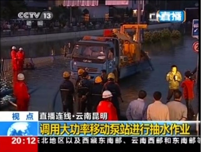 據(jù)央視7月19日“東方時(shí)空”新聞報(bào)道,從2013年7月18日早7點(diǎn)開始,云南昆明市降下了近4年以來最大的暴雨,12小時(shí)降雨量達(dá)190毫米,城區(qū)多處積水,交通受到嚴(yán)重影響。流經(jīng)城區(qū)的盤龍江流量是正常時(shí)期10倍左右,水位大幅上漲,導(dǎo)致江水倒灌。緊靠盤龍江的火車北站隧道是市區(qū)最大的淹水點(diǎn),這條長300多米的汽車和行人通道積水20000立方米左右,最深處達(dá)5米。昆明市排水公司調(diào)來了全市唯一一臺(tái)大功率移動(dòng)排水泵站投入搶險(xiǎn),經(jīng)過一夜的連續(xù)工作,在早高峰前排清了積水,恢復(fù)了該城市主干道交通。